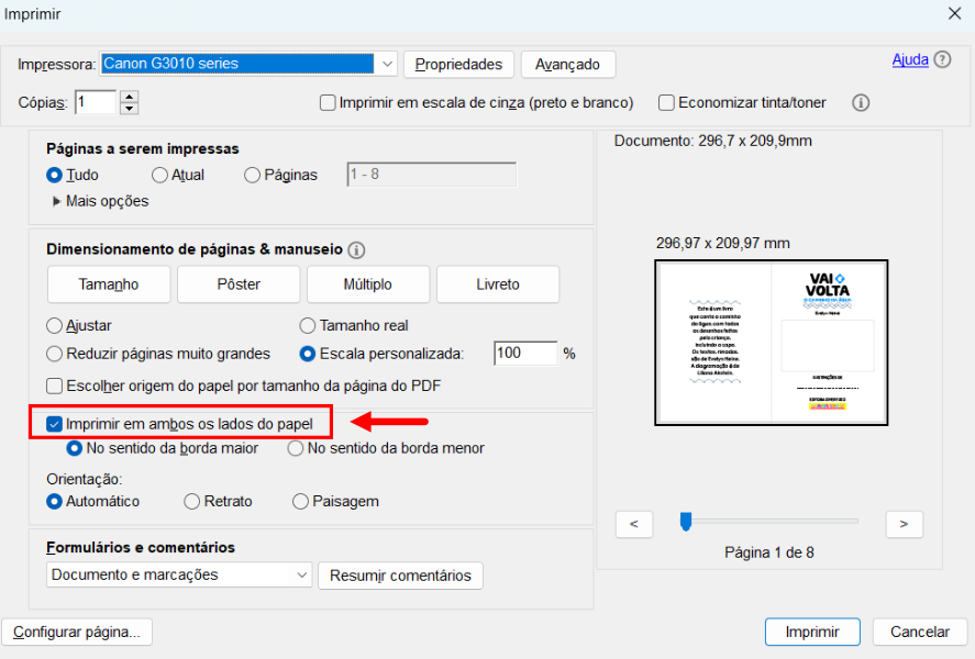 Ou você pode imprimir frente e verso na mesma página. Na hora de imprimir, escolha a opção "IMPRIMIR EM AMBOS OS LADOS DO PAPEL", na configuração de impressão. Siga as instruções da impressora. Ela primeiro imprimirá a frente das páginas e então pedirá para que você vire as páginas para que o outro lado seja impresso.