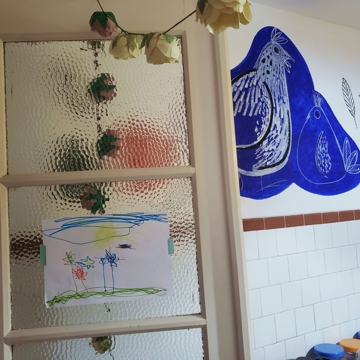 Sim! Cheia de quadros, muitos deles feitos por mim e pela minha filha de três anos, a Rosa. Minha casa é muito colorida e vive com manchas de tinta.