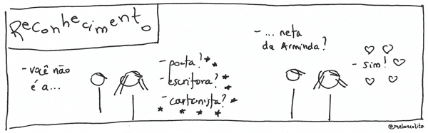 Sim! Quando terminei, pensei: “caramba, estava tudo aqui guardado, só esperando eu me mexer pra poder existir!” Algumas eram sobre situações de entrevistas de emprego, outras de uma escritora fazendo uma foto para a divulgação do livro, que eram situações que estavam no meu radar ou no meu imaginário. Nesse dia fiz também uma série sobre uma loja que tem um nome curioso, pela qual eu passava quase todo dia, e sempre me vinha uma brincadeira na cabeça. Várias que fiz esse dia até hoje ainda não foram para a página, mas estão entre as minhas favoritas, talvez pela lembrança desse primeiro rompante.