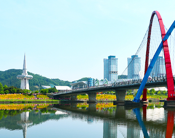 O projeto "Cama de Gato" nasceu na cidade de Daejeon (foto abaixo), na Coreia do Sul. Fui convidado a criar uma obra lá e percebi na cultura coreana uma relação muito forte do lugar com a infância, observando as cores, o design, o modo de se relacionar que as pessoas de lá têm. Isso me levou a pensar em jogos, na minha infância. Lembrei da brincadeira cama-de-gato e achei que ela, com suas cores, poderia conversar com o espaço. O meu trabalho é muito baseado em arte pública (na rua, aberta a todos.). Gosto de criar movimento através dos objetos e passar assim uma mensagem. Então fiz uma instalação no jardim do centro cultural, que é um espaço público. Para as pessoas se depararem com esta intromissão das linhas coloridas no meio da paisagem, das árvores.