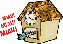Quando bate uma hora, ele faz “miau”. Quando são duas, ele faz “muu, muu”. Às três, “au, au, au”. Quatro horas, “óinc, óinc, óinc, óinc”. Quando são cinco, “glu, glu, glu, glu, glu”, feito um peru. Às seis, lá vai o cuco outra vez: “mé, mé, mé, mé, mé, me”. E às sete? “Piu, piu, piu, piu, piu, piu, piu”... na careca do titio. | |