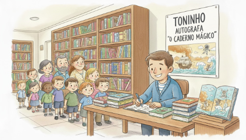 E assim Toninho começou a prestar mais atenção às aulas, não se atrasou mais, estava sempre limpinho e cheiroso. Enfim, o caderno e a caneta foram um ótimo remédio. Mas pensa que a história acabou aí? Isso tudo aconteceu há muitos anos. Hoje, o Toninho é escritor. Escreve livros infantis. Não é famoso nem milionário, mas é respeitado, adora o que faz e vive de seu trabalho. E o melhor: ele continua viajando. Agora sim, fim!