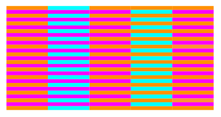 Errado! Há apenas 3 cores: laranja, rosa e azul. A gente enxerga o verde por causa das listras em torno. É só uma ilusão de ótica!