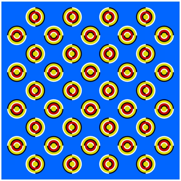 Quando a gente olha para este desenho, parece que os círculos estão se mexendo, não é? Se você acha isto, coloque o mouse em algum deles e você vai perceber que é apenas uma ilusão de ótica. Nada se mexe nesta figura. |