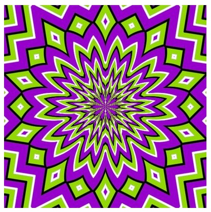 | Na verdade, não. É uma figura, apenas. Mas as cores e formas nos dão a impressão de movimento. Este é um exemplo de "arte cinética". A palavra "cinética" vem do grego e significa "que tem movimento". "Cinema" também tem a mesma origem. |