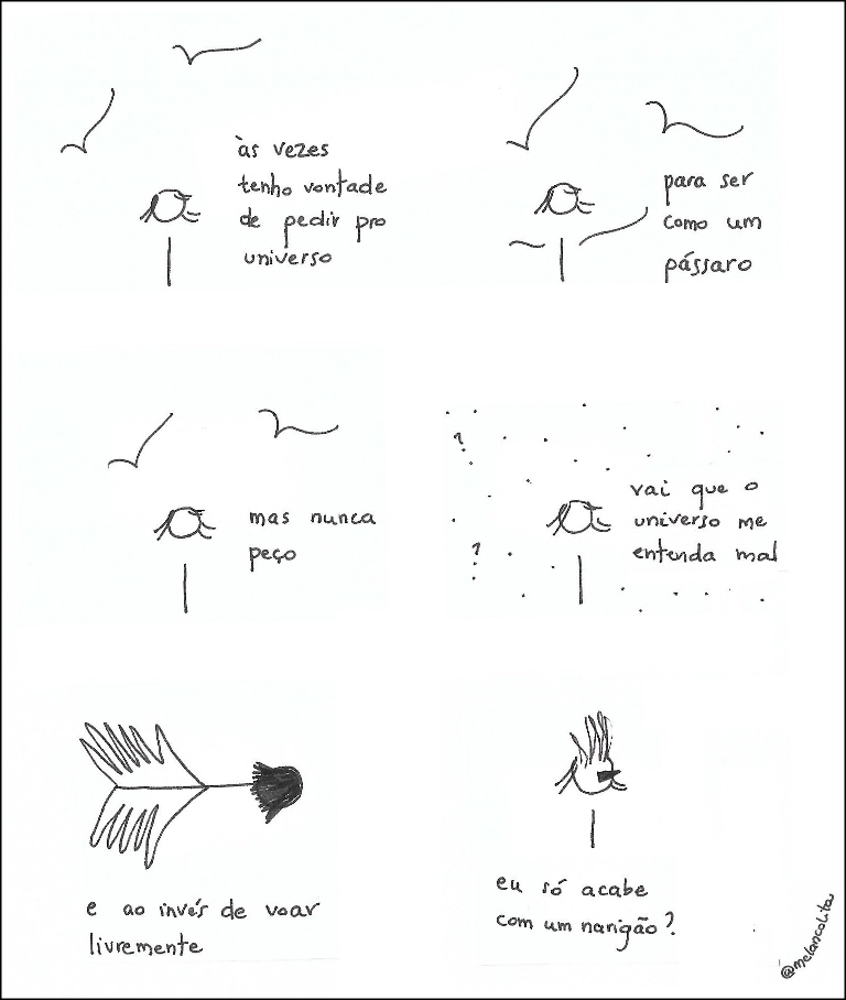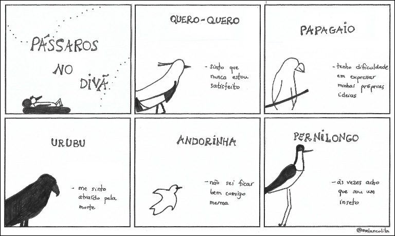 Estas tirinhas são criadas pela poeta, jornalista e apaixonada por pássaros, Lolita Beretta. Elas podem ser encontradas no Instagram @melancolita. |